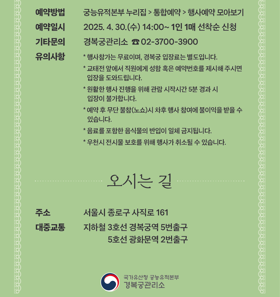 - 사전 예약자만 입장 가능 (현장 예약 불가)
