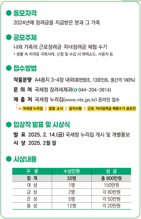 작품분량 A4용지 3~4장 내외(휴먼명조, 13포인트, 줄간격 160%) 문 의 처 국세청 장려세제과(044-204-3814)