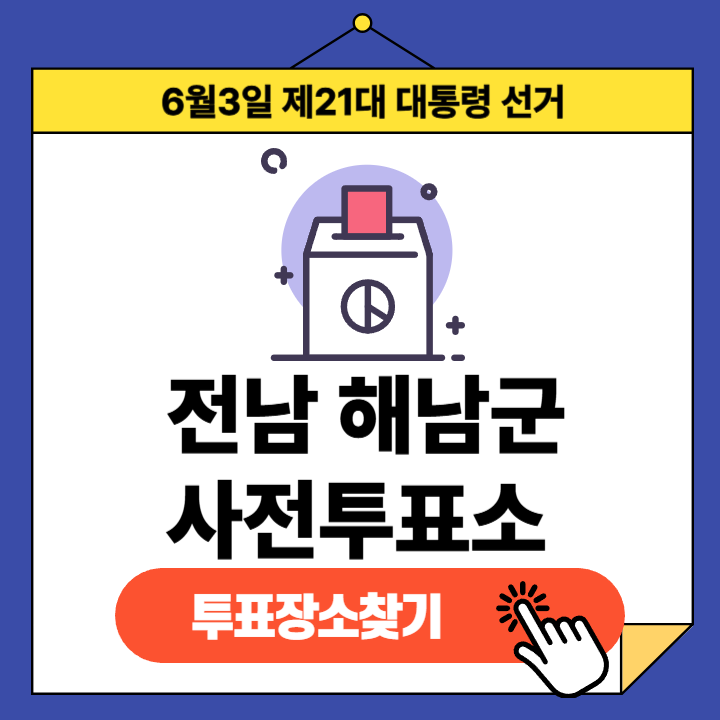 제21대 대통령선거(2025년 6월 3일) 전라남도 해남군 유권자분들을 위한 사전투표소 정보 안내글입니다.