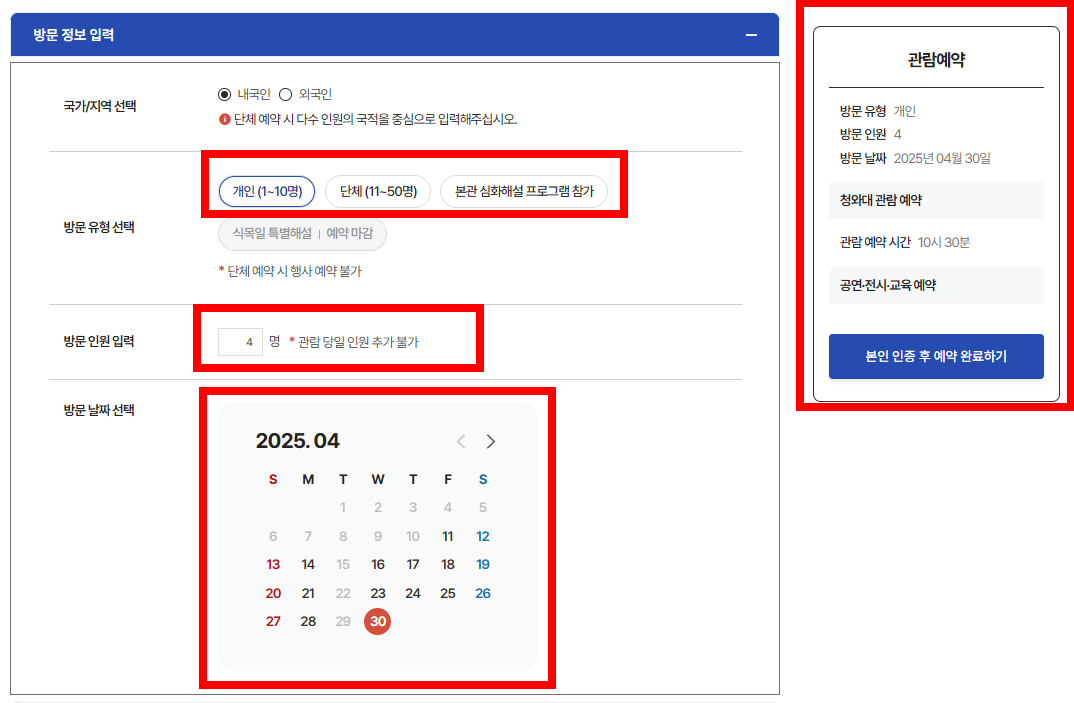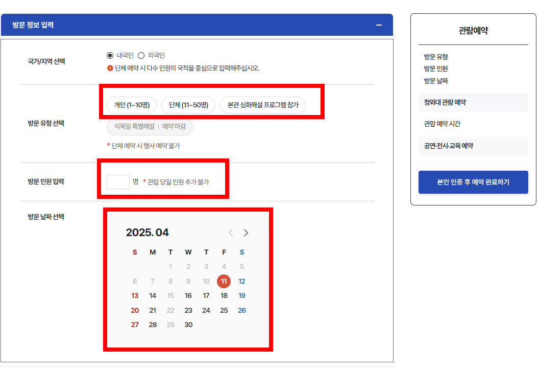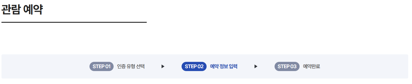 ‘관람 예약’ 메뉴를 클릭하고 원하는 날짜와 시간대, 그리고 관람인원을 선택합니다.