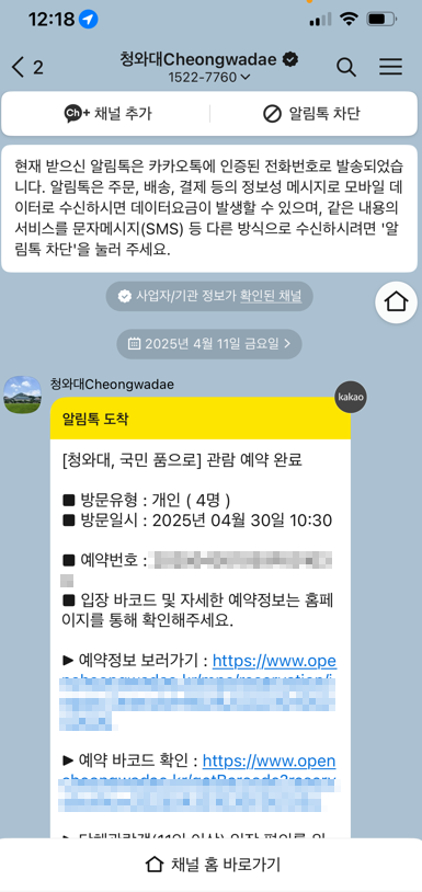 6. 현재 청와대 온라인/모바일 관람신청 예약은 공식 홈페이지에서만 가능합니다. 카카오톡 등의 사칭 채널이나 계정에 주의하시기 바랍니다.