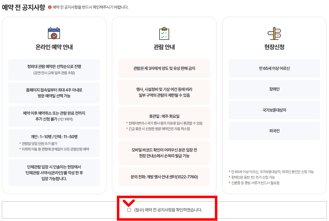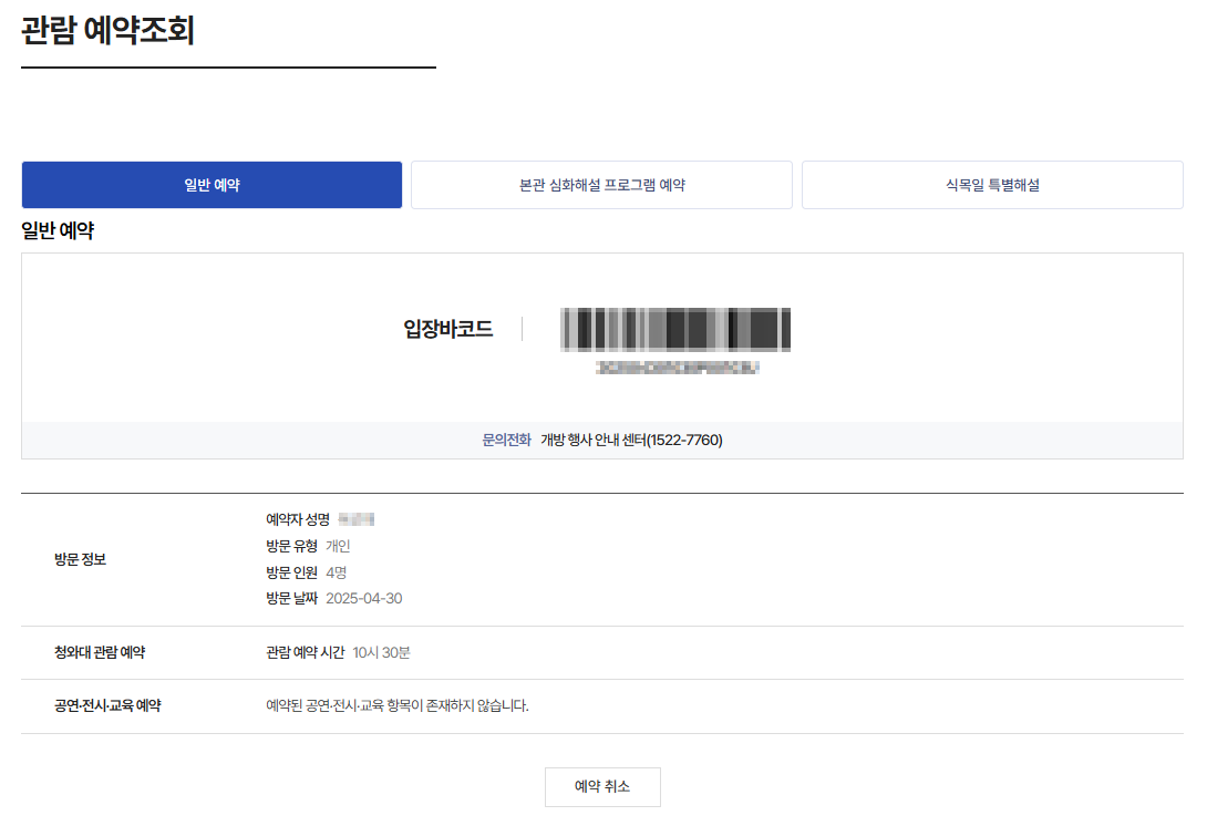 ▶ 예약 바코드 확인 : https://www.opencheongwadae.kr