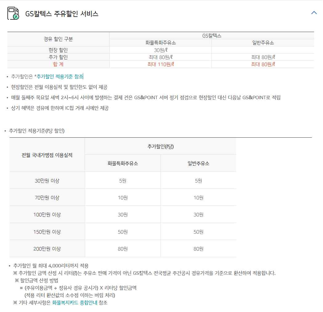 GS칼텍스 화물복지 카드의 경우 현장 할인은 다른 카드와 동일하게 30원/L 적용이 되지만 추가 할인의 경우 전월 이용실적에 따라 최대 80원/L의 할인을 받으실 수 있습니다. 또 한 가지 다른 점은 일반 주유소에서 주유할 경우 현장 할인은 받으시지 못하지만 전월 실적 기반으로 최대 80원/L의 할인을 받으실 수 있습니다.