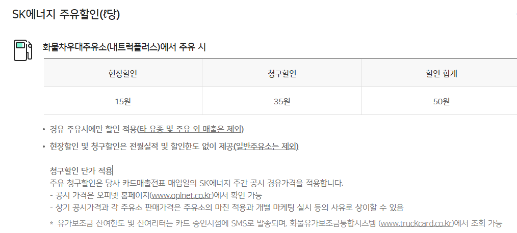 SK화물복지 50도 S-OIL화물복지 50과 동일하게 현장 및 청구할인이 전월 실적 상관없이 50원/L의 혜택을 받으실 수 있습니다. 단, 화물차우대주유소(내트럭플러스)에서 주유할 경우에만 혜택을 받으실 수 있습니다.