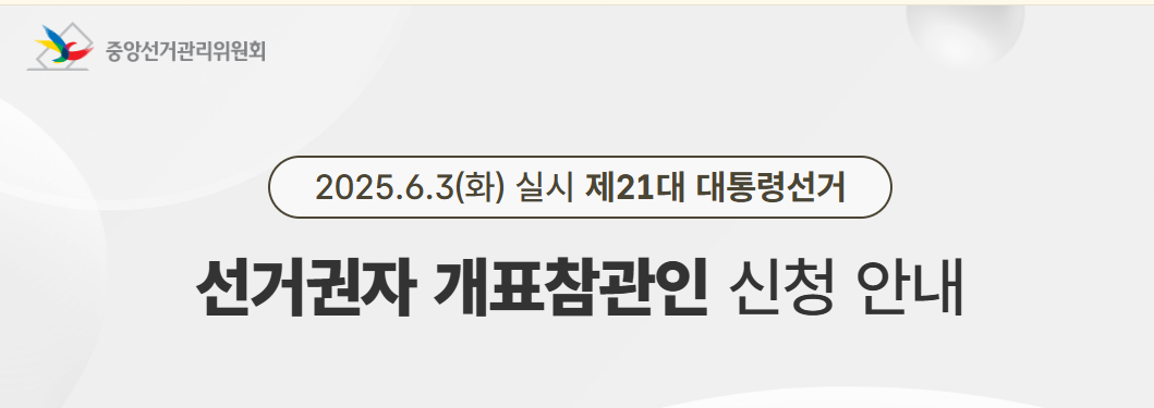 중앙선거관리위원회는 제21대 대통령선거 개표상황을 참관할 선거권자 개표참관인을 5월 5일(월)부터 9일(금)까지 공개 모집한다.
